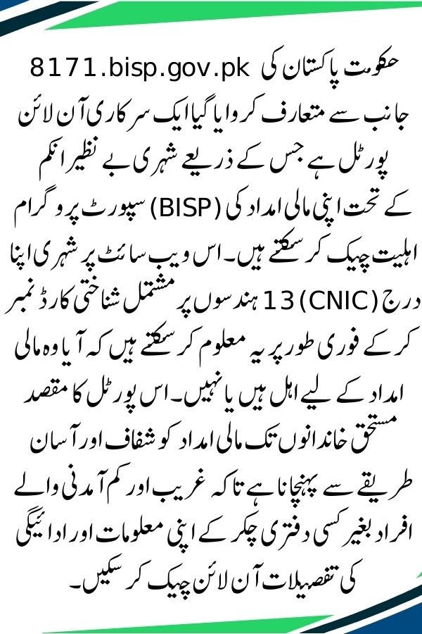 The 8171 BISP portal is designed to simplify the process of checking eligibility for government welfare programs. It provides real-time information about payments, eligibility status, and registration for assistance programs managed under BISP.