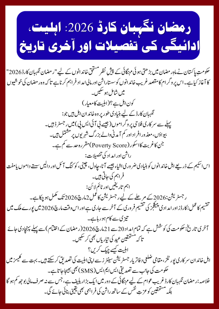 The Ramzan Negahban Card 2026 is a special welfare initiative launched to support low-income families during the holy month of Ramadan. Due to rising inflation and increasing living costs, many households struggle to manage daily expenses. To help deserving families, the government has introduced the Negahban Card program which provides financial assistance and essential food support during Ramadan.