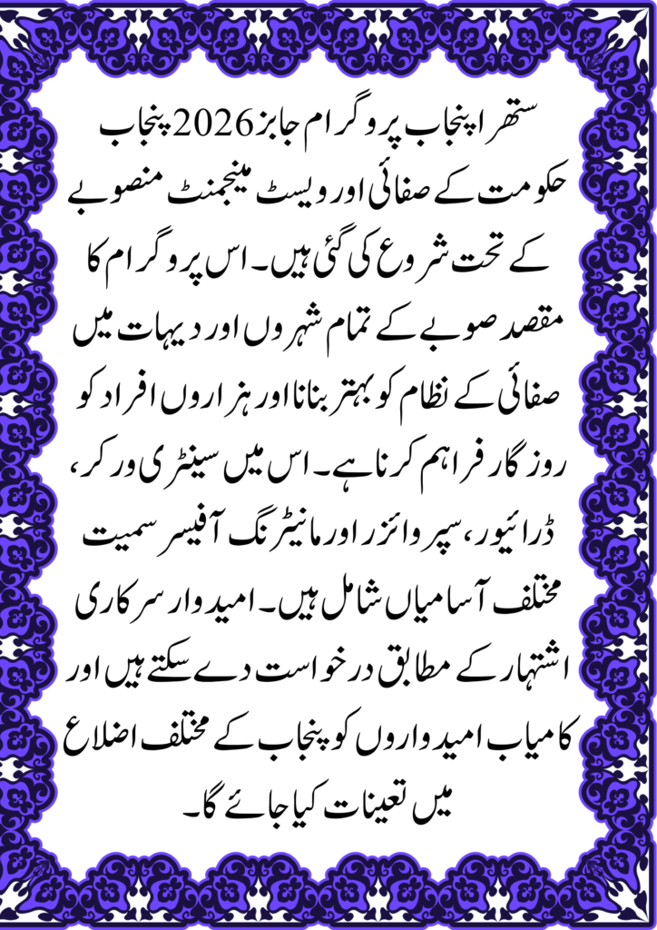 The Suthra Punjab Program Jobs 2026 have been announced under the Government of Punjab’s large-scale cleanliness and waste management initiative. This program aims to create employment opportunities while improving sanitation systems across cities and rural areas. Thousands of jobs are expected to be available for sanitary workers, supervisors, drivers, monitoring officers, and administrative staff. The program is part of the provincial government’s effort to make Punjab cleaner, healthier, and environmentally sustainable.